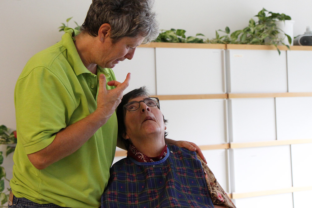 Jolanda lebt mit ihrer mehrfachen Behinderung auf der Wohngruppe Rietberg. Sie äussert sich mit den Augen, indem sie nach oben oder unten schaut.